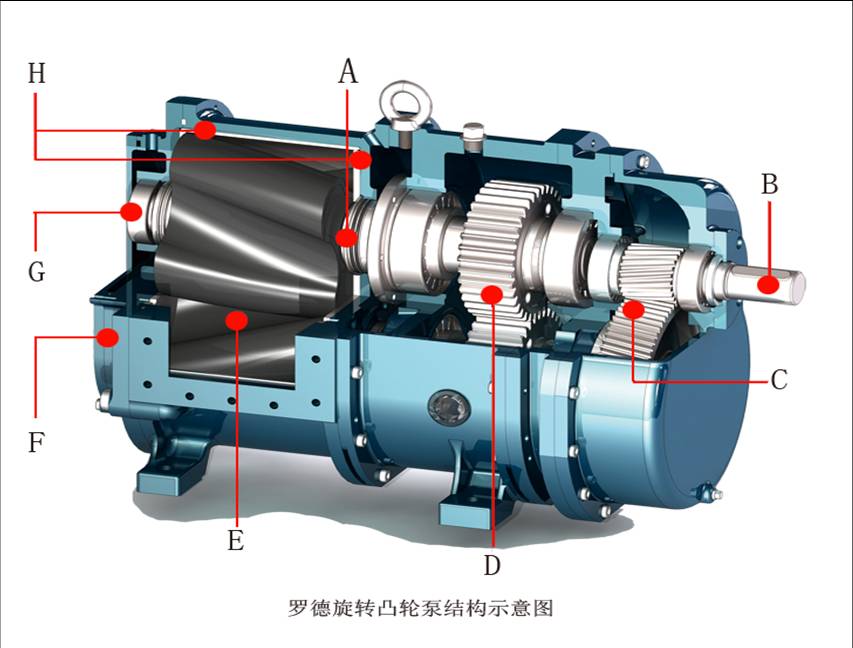 A—机械密封;B—轴;C—减速齿轮;D—同步齿轮;E—转子;F—快开式泵盖;G—轴承;H—耐磨衬板